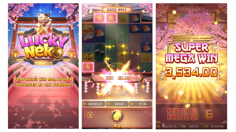 Lucky Neko เกมสล็อตออนไลน์ แบบวีดีโอที่ มีตาราง 6 รีล 5 แถว (มีรีลเพิ่มเติมที่ด้านบนของรีล 2, 3, 4 และ 5ที่จะปรากฏบนวงล้อ) เป็นเกมสล็อตที่มีตัวคูณสัญลักษณ์ Wilds-on-the-Way และ Cat เพิ่มตัวคูณการชนะด้วย 2 เมื่อไหร่ก็ตามที่สัญลักษณ์แมว 1 ตัวขึ้นไปปรากฏบนวงล้อ ลุ้นรับฟรีสปิน 10 ครั้งขึ้นไปเมื่อสัญลักษณ์กระจาย 4 ตัวเพื่อทำการเรียกใช้ฟีเจอร์ฟรีสปินได้ทันที่สัญลักษณ์แมวครบทำให้เกมนี้ เป็นเกมสล็อตมาพร้อมธีมสายมงคลที่นำเอาแมว Neko แมวนำโชค กวักโชคลาภมาให้แก่ผู้เล่น ใครที่ชื่นชอบเกมสล็อตสายมงคลหรือเกมสล็อตที่มีกลิ่นอายของประเทศญี่ปุ่น ทางเราอยากจะแนะนำให้เล่นเกมสล็อตตัวนี้เลย เพราะ เจ้าแมว Neko จะมาช่วยเรียกโชคเรียกลาภและเรียกโบนัสตัวคูณต่าง ๆ ภายในเกมมาให้แก่ผู้เล่นทุกคน