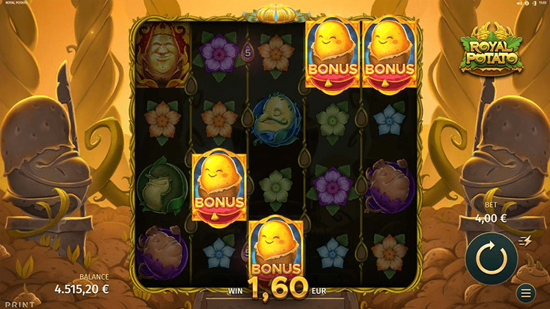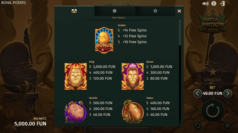 ตารางเกมของ Royal Potato มีขนาดใหญ่กว่า Crystal Golem ประกอบด้วย 5 วงล้อและ4 แถวโดยมีตำแหน่ง SuperSpinner 14 ตำแหน่ง ปรากฏขึ้นระหว่างวงล้อ (เพิ่มเติมด้านล่าง) เมื่อรวมกับการปรับแต่งกราฟิกแล้ว สถิติของ Royal Potato ก็น่านับถือเช่นกัน โดยเริ่มต้นด้วยการจ่ายเงินเฉลี่ยตามทฤษฎี ที่96.27%เพิ่มขึ้นเป็น97.14%เมื่อ ซื้อ รอบหมุนฟรี ศักยภาพเพิ่มขึ้นอย่างมีนัยสำคัญ ในขณะที่ความผันผวนเกิดขึ้นที่การตั้งค่าปานกลาง/สูง ซึ่งสังเกตได้ชัดเจนเป็นพิเศษเมื่อซื้อคุณสมบัตินี้ สามารถเล่นได้ตั้งแต่ 20 c/p ถึง €/$50 ต่อการหมุน การข้ามตารางเกมมี30 ช่องจ่ายเงินสำหรับผู้เล่นที่จะชนะชุดค่าผสมสามถึงห้าชนิด สัญลักษณ์ทั้งหมดได้รับการออกแบบมาโดย เฉพาะสำหรับ Royal Potato และประกอบด้วยสัญลักษณ์ดอกไม้ที่จ่ายต่ำสี่อันซึ่งมีมูลค่าสูงถึง1.5 ถึง 3 เท่าของเงินเดิมพัน ตัวละครที่จ่ายกลางสี่ตัวที่เรียกว่า Kennebec, Russet, Yukon และ Desiree ซึ่งมีมูลค่าสูงถึง6-12.5 เท่าของการเดิมพัน แล้วมีกษัตริย์และราชินีที่ได้รับค่าตอบแทนสูงสององค์ สองอันหลังมี มูลค่า25-50x ของการเดิมพันเมื่อตีห้าชนิด สัญลักษณ์ไวด์จะไม่ปรากฏในเกมหลักแต่สัญลักษณ์ไวด์จัมโบ้นั้นมีประโยชน์ในระหว่างการหมุนฟรี