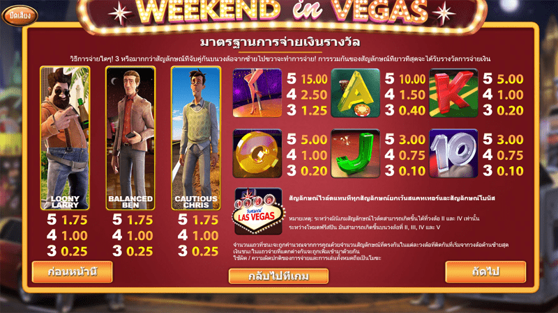 ฟีเจอร์ Any-Ways-Pay ช่วยให้มั่นใจได้ว่า Weekend in Vegas เป็นเกมที่ได้รับรางวัลสูง Betsoft ออกแบบเกมโดยไม่มีช่องจ่ายเงิน แต่มี 243 วิธีในการชนะแทน เพียงสร้างชุดค่าผสมที่ชนะด้วยสัญลักษณ์ที่ตรงกัน 3 อันขึ้นไป การรวมกันเหล่านี้เกิดขึ้นจากซ้ายไปขวาตามวงล้อ ตัวละครที่เป็นมิตร 3 ตัวของเราเป็นสัญลักษณ์ที่มีมูลค่าต่ำกว่า ได้แก่ Loony Larry, Balanced Ben และ Cautious Chris มอบรางวัลที่สูงขึ้นจากไอคอนไพ่ที่มีสไตล์ ไพ่เหล่านี้มีตั้งแต่ 10 ถึง A และเสนอเงินเดิมพันของคุณ สูงถึง 200 เท่า สัญลักษณ์นักเต้นรูดเสาเสนอเงินเดิมพันของ คุณสูงถึง 300x