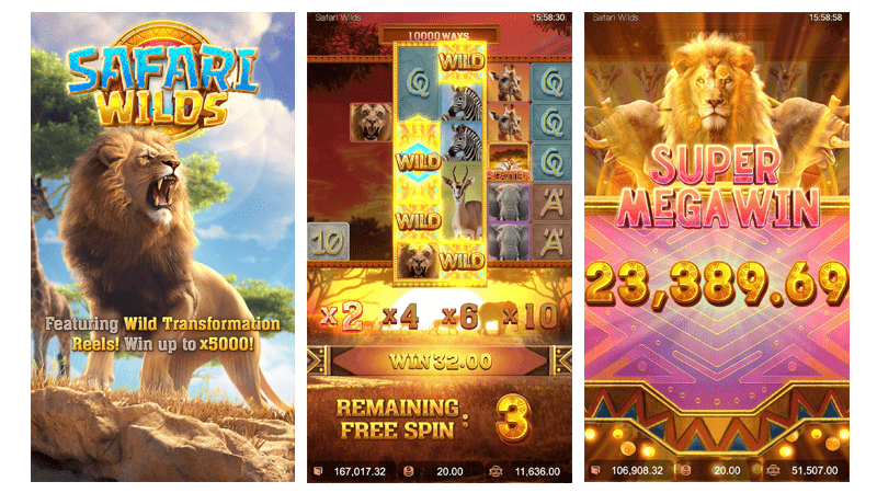 Safari Wilds เป็น วิดีโอสล็อต 6 วงล้อ (5 แถวในวงล้อ 1, 2, 5 และ 6, 6 แถวในวงล้อ 3 และ 4) ที่มีวงล้อ Wild Transformation และตัวคูณที่เพิ่มขึ้น การชนะใด ๆ ก็ตามจะเพิ่มตัวคูณการชนะและเปลี่ยนสัญลักษณ์ที่ชนะบนวงล้อที่ 3 และ 4 ให้เป็นสัญลักษณ์เสริม! นอกจากนี้การรวบรวม สัญลักษณ์ Scatter 4 อันจะทำให้เกิดการ หมุนฟรี 12 ครั้งและเพิ่มตัวคูณการชนะด้วยเช่นกัน! ในทุ่งหญ้าสะวันนาอันกว้างใหญ่ของแอฟริกา หมอกยามเช้ายังคงอยู่ในขณะที่เสียงคำรามของสัตว์ป่าดังก้องไปในอากาศ ทำลายความสงบยามเช้า สัตว์ป่าหลายชนิด เช่น สิงโต เสือชีตาห์ แรด และยีราฟ ต่างเรียกสถานที่แห่งนี้ว่าบ้าน แต่ก็มีการกล่าวกันว่าเป็นสถานที่ซ่อนโบราณวัตถุและสมบัติโบราณที่สูญหายจำนวนมาก นักสำรวจชื่อแจ็คกำลังค้นหาสมบัติบนดินแดนอันกว้างใหญ่และไร้ขอบเขตแห่งนี้ แม้ว่าเขาจะมีประสบการณ์มากมาย แต่นักล่าขนาดยักษ์เหล่านี้ก็ยังคงเป็นภัยคุกคามต่อความก้าวหน้าของเขา คุณจะกล้าเดินป่าผ่านหนามและดวงอาทิตย์ที่แผดเผาเพื่อช่วยเขาค้นหาสมบัติเหล่านี้หรือไม่?