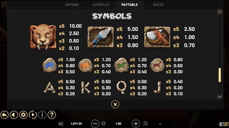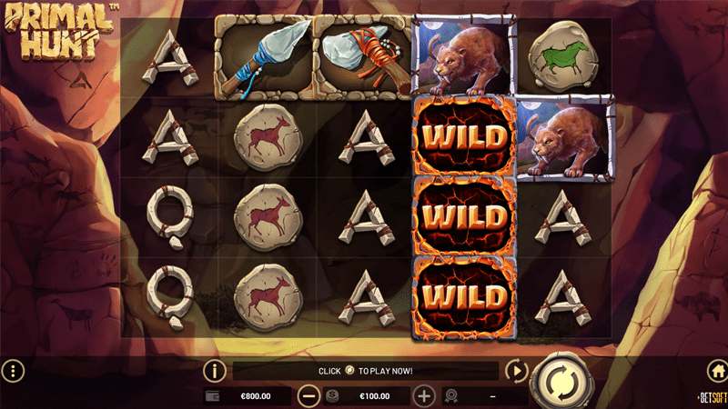 Primal Hunt จะนำคุณย้อนเวลากลับไปในยุคที่การเอาชีวิตรอดเป็นเป้าหมายหลักของการดำรงอยู่ และช่วงเวลาที่เรียบง่ายนี้ยังมาพร้อมกับชุดโบนัสที่เรียบง่ายอีกด้วย ในเกมหลัก คุณจะได้รับประโยชน์จากสัญลักษณ์เสริมที่สามารถลงบนวงล้อกลาง 3 อันเท่านั้น นั่นก็คือวงล้อที่ 2, 3 และ 4 ในกรณีที่คุณสงสัยไวด์มักจะตกลงเป็นกองๆ และสัญลักษณ์สิงโตถ้ำปกติที่มีมูลค่าสูงสุดสามารถลงจอดในตำแหน่งที่มีความสูง 2 หรือ 3 ตำแหน่ง ซ้อนกันได้ ในความเป็นจริง การลงจอดของสัญลักษณ์เกิดขึ้นบ่อยครั้งในเกมนี้ แต่มีเพียงสิงโตเท่านั้นที่จะมาเป็นสัญลักษณ์ภาพเดียวเมื่อลงจอดในเวอร์ชันขยาย นั่นเป็นเพียงเกมหลักเท่านั้น ตอนนี้เรามาดูเนื้อหาหลักกันดีกว่า